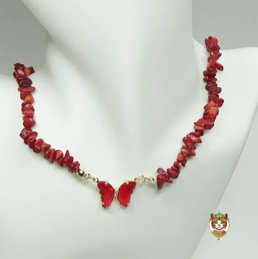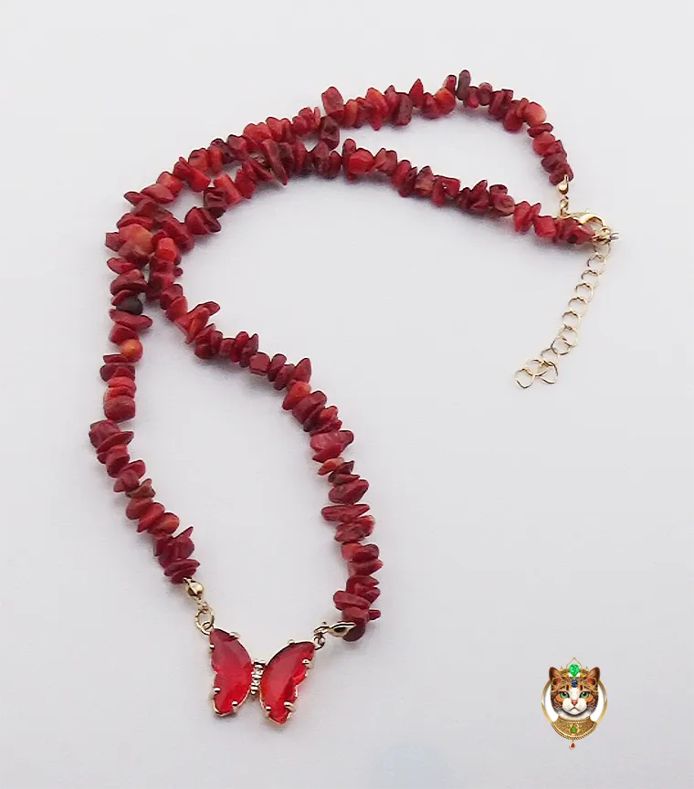 Butterfly Red Coral Necklace. Let your spirit soar with this striking Butterfly Red Coral Necklace. Featuring natural red coral gemstone beads and a faceted crystal shaped into a radiant butterfly design, this piece exudes warm energy and confident charm. Suspended on a fine chain with a secure clasp, it’s perfect for autumn afternoons, rustic retreats, or simply adding a touch of earthy elegance to your day.