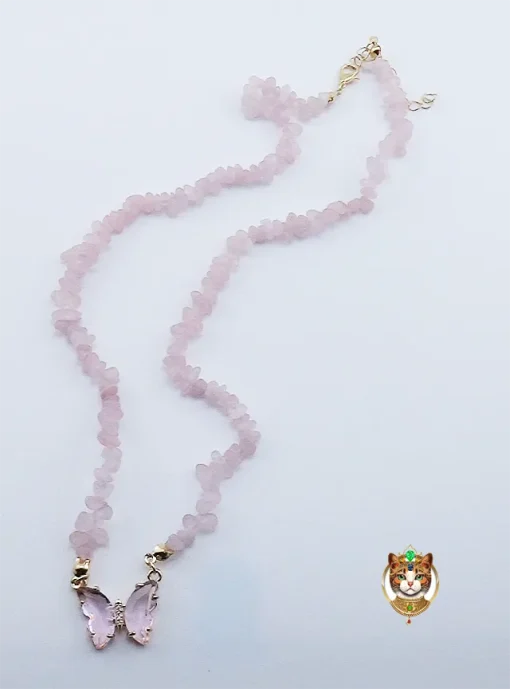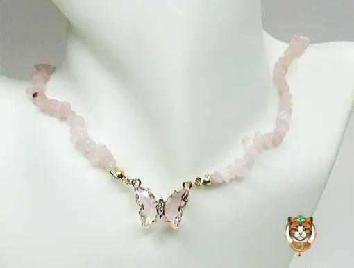 Butterfly Rose Quartz Necklace. Wrap yourself in warmth and grace with this tender Butterfly Rose Quartz Necklace. Adorned with natural rose quartz gemstone chips and a faceted crystal butterfly centerpiece, this necklace glows with the soft blush of unconditional love.